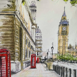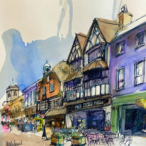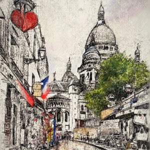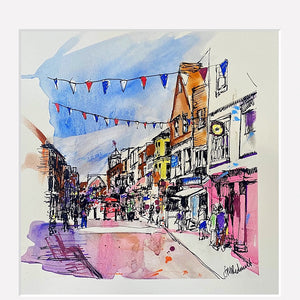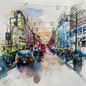 My street scene paintings are created using a combination of watercolor and fine liner, capturing the vibrant energy and character of urban life. I work in a looser, more expressive style that allows for spontaneity and movement, blending delicate washes of color with the sharp contrast of fine line detailing. This approach gives each piece a lively, sketchbook quality—balancing structure with freedom—and highlights the charm, rhythm, and architectural personality of the streets I depict.