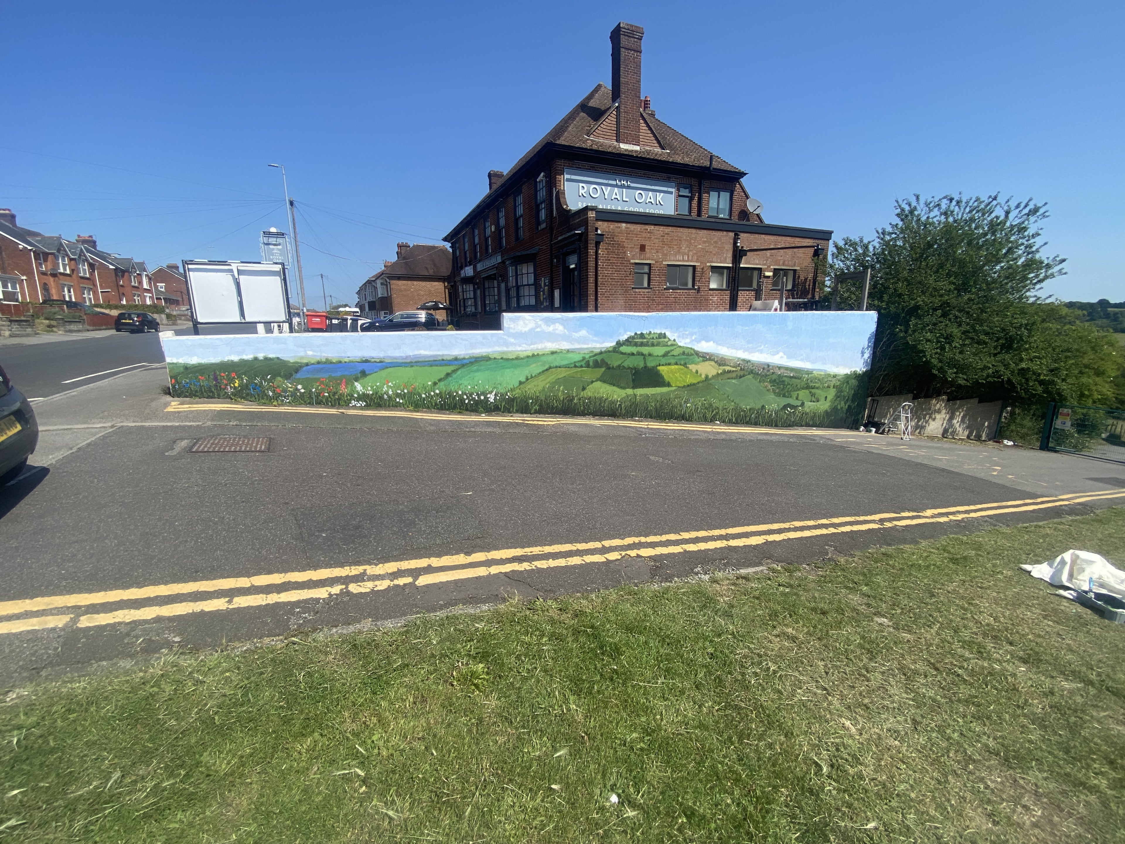Their vision was to showcase the stunning view of Old Sarum, a landmark that can be seen from the school itself. To bring this to life, I painted a vibrant mural with colourful flowers in the foreground, framing the historic landscape beyond. The finished piece celebrates the beauty of Salisbury’s surroundings while creating a cheerful and welcoming entrance for pupils and visitors alike.